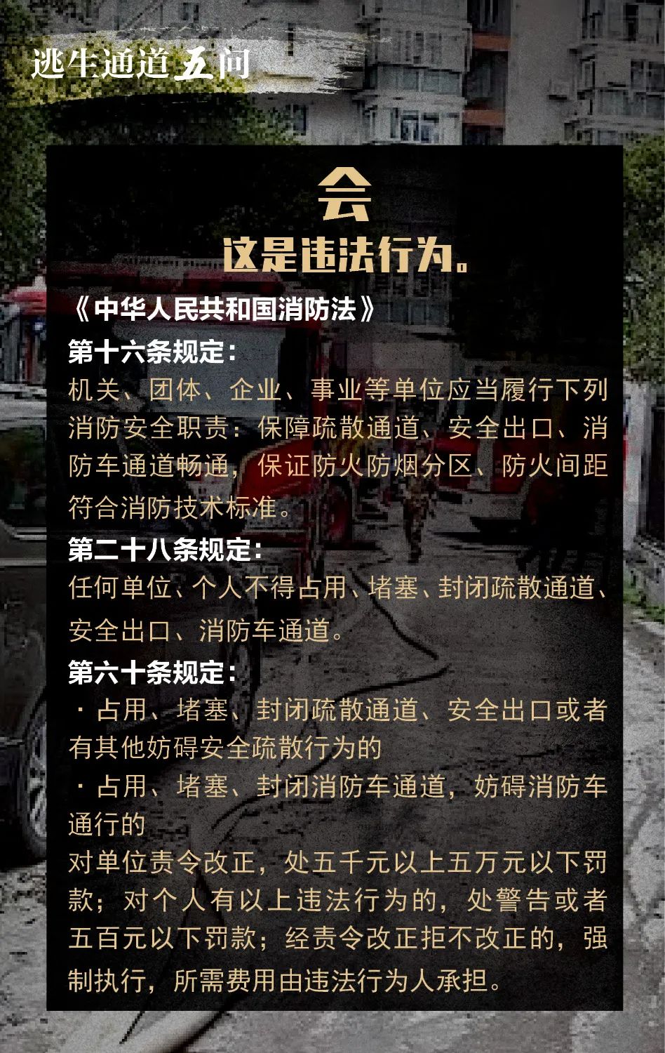 第二十八条 任何单位或个人不得损坏、挪用或私自拆除或停用消防设备和设备,不得埋压、圈占、堵塞消防栓或占用消防间距,不得占用、堵塞或关闭疏散通道、安全通道和消防车通道。影响逃生和灭火救援的障碍物不得设置在人员密集场所的门窗上。