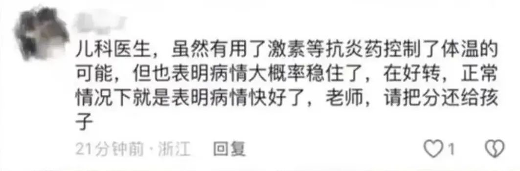 一些自称是儿科医生的网友给出了一个结论:“虽然体温可能是用激素等抗炎药控制的,但也说明病情有很大概率稳定下来,正在好转。”所以孩子回答“病人快好了”,符合逻辑,表现出知识和实践能力。