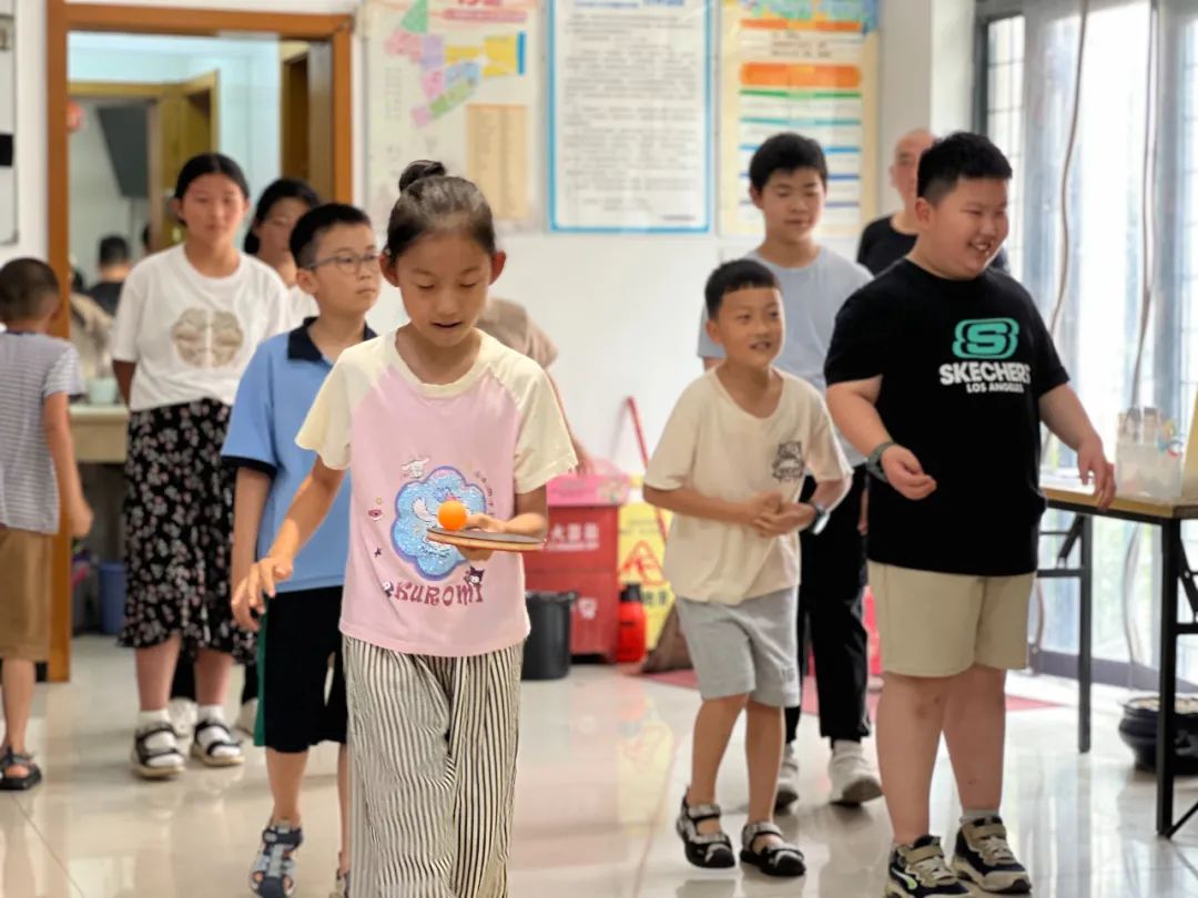 “给油,给油!”.....暑假成长营的第一课叫“乒乓球运球”,孩子们各自分队。第一个用乒乓球拍把球运到终点的队伍就能赢。这考验的是每个人的身体可靠性和团队合作精神,属于素质拓展课程。我看到孩子们一手拿着球,一手保持稳定,玩得很开心。社区活动室里一个接一个地响起了欢呼声和嘶嘶声。