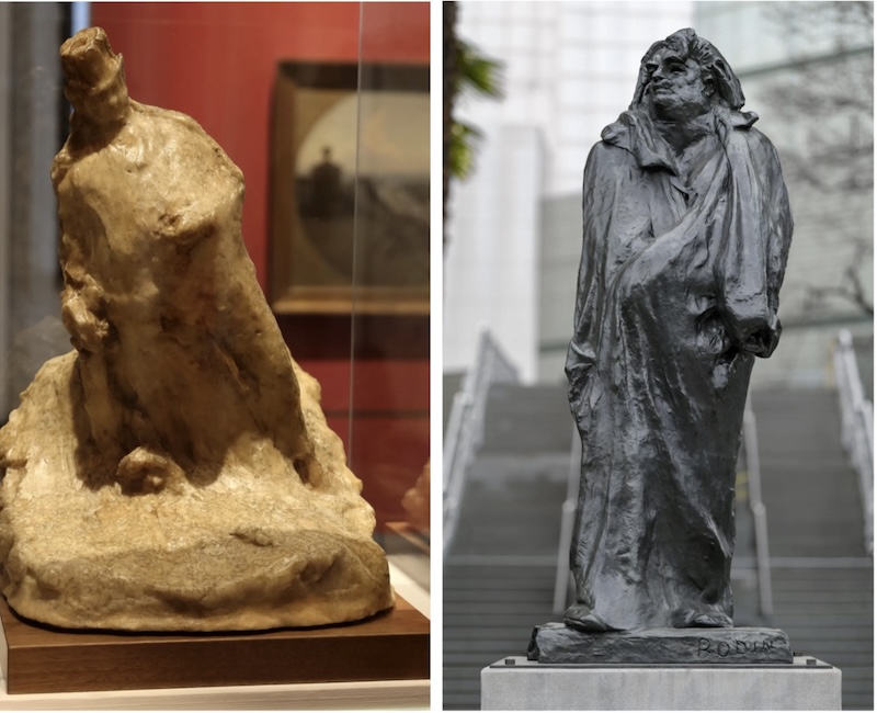 左:梅达尔多·罗索,赌徒(约1893)–1895年),蜡和石膏;右:罗丹,巴尔扎克纪念碑(1897年塑造,1967年锻造),黄铜,都不是这次展览的展品。