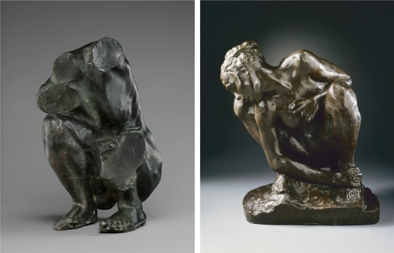 《蹲伏女子躯干》(原形创作于1884-1885年左右,锻造于1913年左右),是一座青铜雕塑;右:奥古斯特·罗丹,《蹲伏女子》(1880-1882年)(图片由洛杉矶郡立艺术博物馆提供 非本次展览展品)