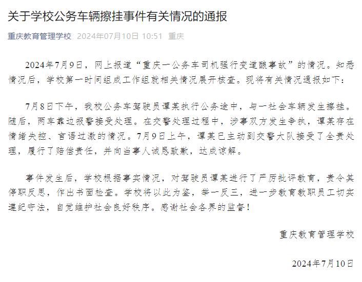2024年7月9日,网上报道了“重庆某公务车司机强行变道酿事故”的情况。了解情况后,学校组成工作组对相关情况进行审查。现将有关情况通知如下: