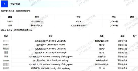 6月初,中国石化浙江石油分公司宣布2024年春季招聘拟录用人选和补充人选,其中数据分析岗位拟录取人选为湖北经济学院统计学专业刘某平、杭州师范大学大数据管理与应用专业两名本科生。补充候选人名单上全是研究生,来自哥伦比亚大学、爱丁堡大学、新加坡国立大学等知名大学。