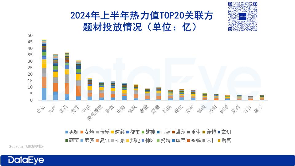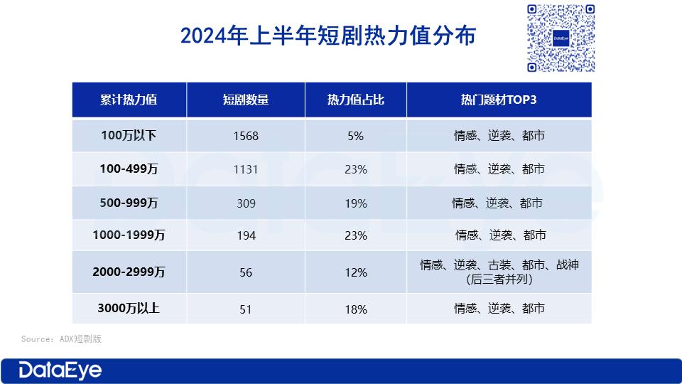 ADX短剧版数据显示:情感和反击在细分主题榜单中排名前两,热值遥遥领先;城市主题类进步很快,升至第三;战争将跌出前三,排名第四。