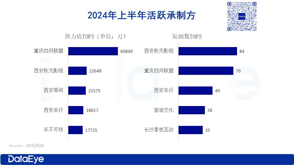 制片人百花齐放,但重庆四月联盟等新寡头也出现了。上半年,重庆四月联盟制作短剧的热值以悬崖般的速度领先,占10%以上。