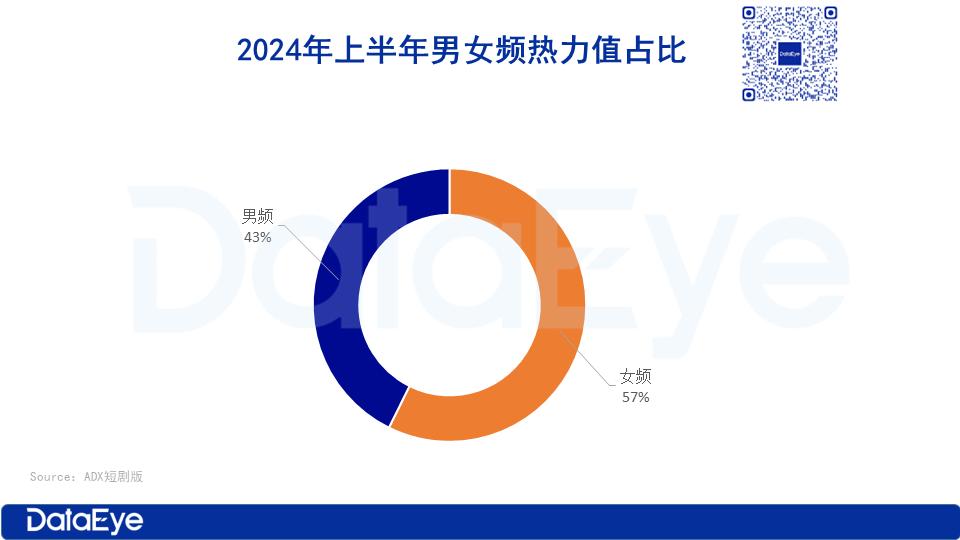 据ADX短剧版数据显示,2024年上半年,女性频率热值占男性频率的43%,优势较年初有所扩大(年初女性频率约为53%)。