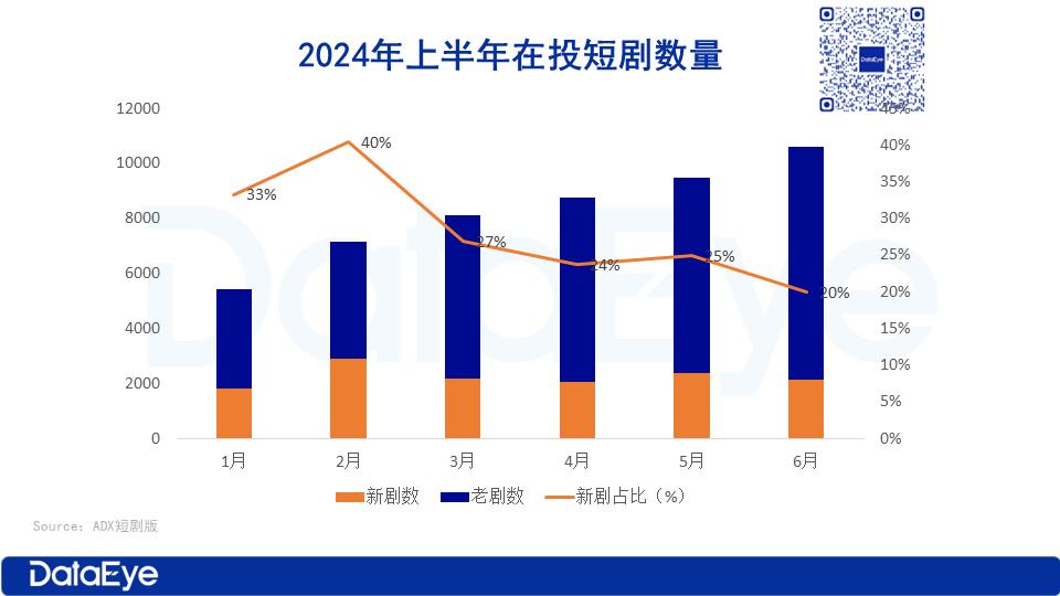 ADX短剧版数据显示:2024年上半年,参与投流的微剧总数(去重)超过2万部,其中新剧总数超过1.35万部,约占68%;上半年,每月有8259部短剧,其中2240部是新剧。
