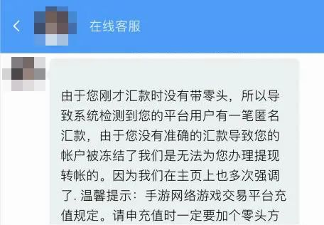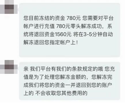 小王联系平台客服,对方表示因为汇款时没有零头导致账户被冻结,需要支付780元的解冻费。