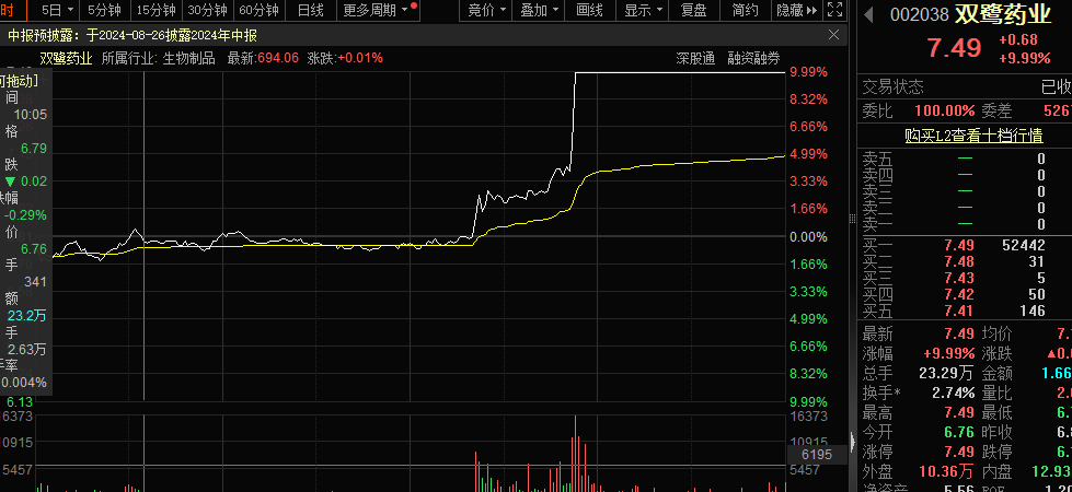 双鹭药业午盘后大幅上涨,直线上涨,全天成交额1.66亿元。
