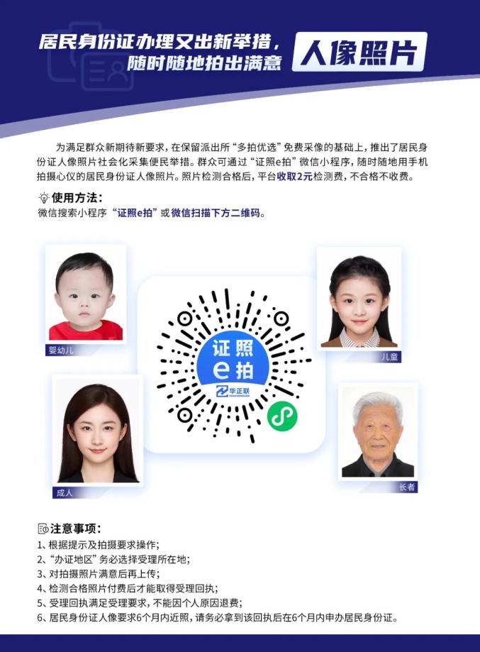 这个便民措施的操作步骤简洁明了:1、进入微信并搜索“证件e拍”小程序,关注并注册帐户个人帐户;2、根据系统提示,在小程序中选择“在线拍照”功能,完成拍摄。拍摄过程中,请保证光线充足,背景整洁,防止穿浅色或图案明显的衣服,不要佩戴耳环、颈链等饰品,面部无遮挡,不要佩戴化妆品隐形眼镜,表情自然,不要使用美颜、滤镜等功能进行处理; 3、审核通过后,系统将生成电子“数码照片受理收据”。申请人可以凭此回执到最近的公安部门户籍窗口办理身份证补(换)领等服务。