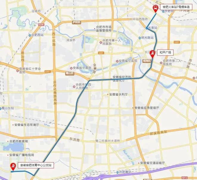 站点:合肥火车站公交7号候车岛,和平广场,安徽合肥体育馆公交站。