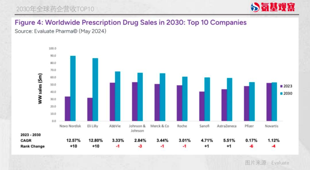 根据Evaluate的预测,2030年全球制药收入TOP10将迎来大洗牌——诺和诺德登顶,礼来第二,艾伯维第三。在此之前,诺和诺德被归类为中型企业;四年前,礼来的市值还不到强生的一半。