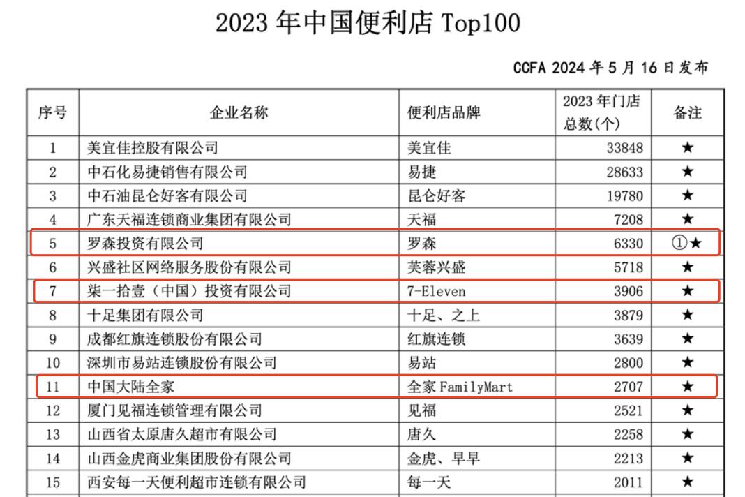 罗森和7,同样是日本便利店的同一名单。-Eleven,2023年,其门店数量分别为6330家3906家,分别排在第五位和第七位。