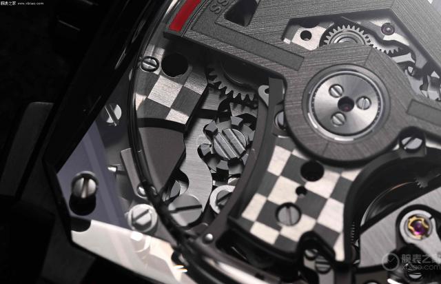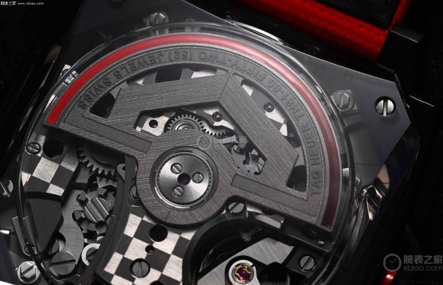 TH81-00 运动具有非常鲜明的一体化结构,整个部件主要由钛金属材料制成。钛金属材料有很多优点,但目前最常见的原因之一是在加工过程中容易硬化,加热快,容易氧化,大大增加了抛光难度。但是透过表背我们可以清楚地欣赏到 TH81-00 手动装饰机芯后,表现出精细的磨砂摆陀夹板,包括抛光倒角。抛光螺丝与喷砂饰面相辅相成。此外,中央板桥还配有泰格豪雅的标志性棋盘格子图案,具有强烈的赛车竞技色彩。整个机芯抛光仍然保持着一流的技术水平。