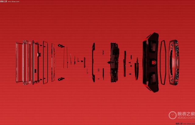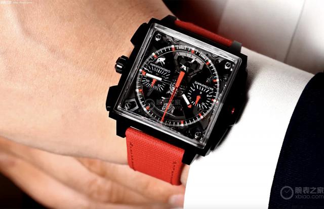 图片中的红色表款配有红色漆面镂空中心追针指针,位于中心。 3 分钟指针和点钟位置 9 在方形黑色副表盘的衬托下,点钟位置的小时指针也采用了红色漆面处理,显得格外醒目。副表盘边缘采用巧妙的弧形设计,还带有白色刻度。在圆形分钟轨道上印有清晰的白色刻度和白色和红色小时刻度,以提高手表的读时性能。