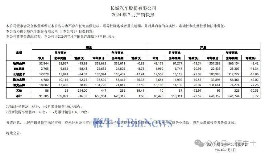 长城汽车今天发布公告,7月份总销售额为91285辆,比去年同期下降16.32%;在这些车型中,新能源汽车销售24145辆,1-7月累计销售156519辆。