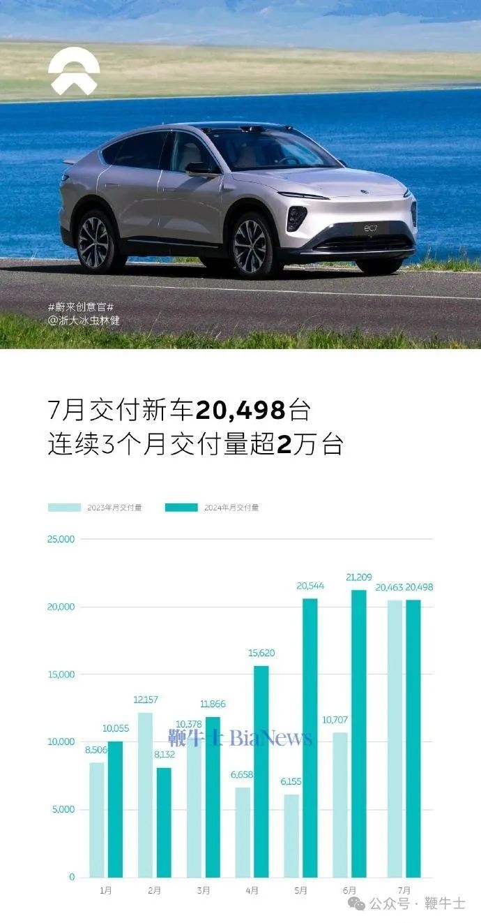 蔚来汽车7月份发布销售报告,7月份交付20,498辆,环比下降3.4%;自2024年初以来,交付了107,924辆车,比去年同期增长了43.9%。截至2024年7月31日,累计交付量达到557,518辆。