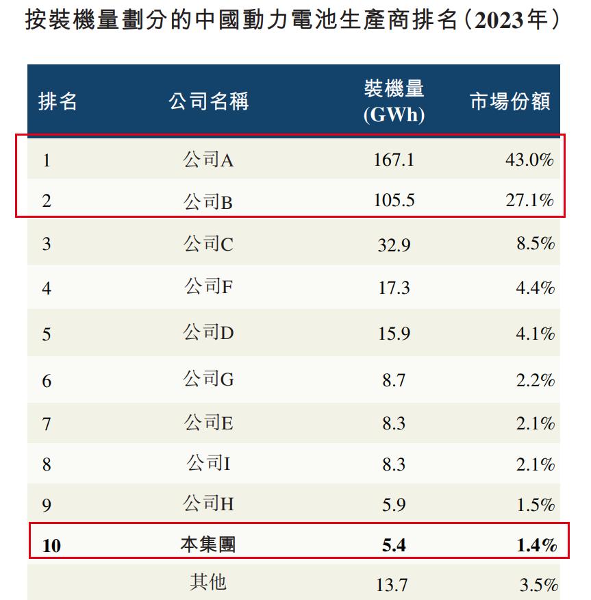 在曹芳和陈继程的带领下,李正新能也在行业内占有一定地位。根据中国汽车动力电池产业创新联盟和弗若斯特沙利文的数据,2023年,集团动力电池安装量为5.4。GWh,中国动力电池制造商排名第十,市场份额为1.4%。