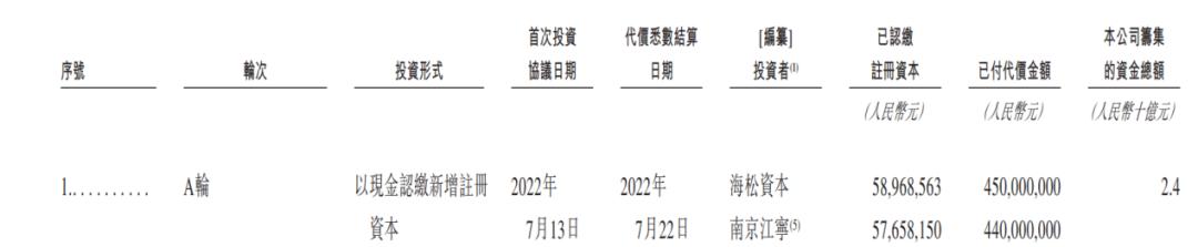 其中,A轮融资为2022年7月,投资方包括海松资本、中金上汽产业投资、厦门国际贸易、建发产业投资等,募集资金24亿元。