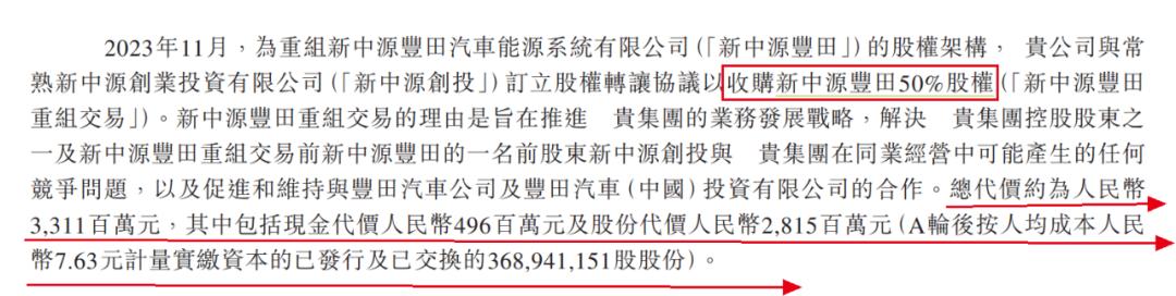 2023年11月,新中源创投将新中源丰田50%股份转让给正力新能,套现33.11亿元。其中,现金成本为4.96亿元,股权成本为28.15亿元。