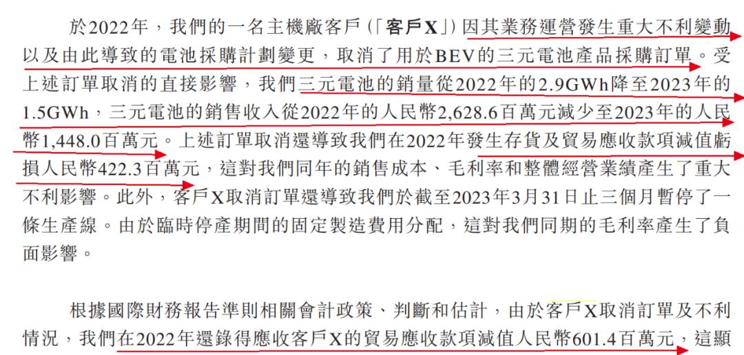 2022年,客户X因业务经营发生重大不利变化和电池采购方案发生变化,取消了BEV三元电池产品采购订单。