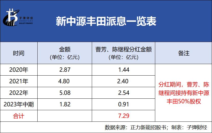 曹芳和陈继程在出让新中源丰田股份之前也获得了一笔红利。