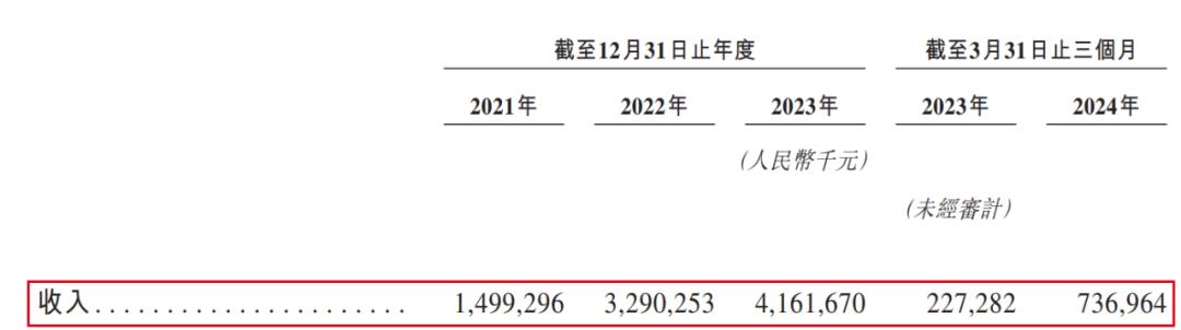 根据招股书,2021年至2024年3月(以下简称:报告期)的收入分别为14.99亿元、32.90亿元、41.62亿元和7.37亿元。