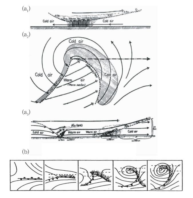 1910年,威廉·皮叶克尼斯开始在天气图上绘制流线。通过收集到的路面和高空观测数据,他提出了中纬度气流发展的气流模型和极锋理论,如下图所示。这构成了一个完整的系统,包括天气理论、天气图分析和预测模式。