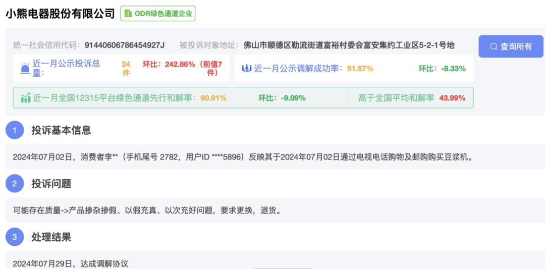 根据国家公示信息,今年7月2日,一位姓李的消费者报告说,他通过电视电话购物和邮购购买豆浆机可能存在质量问题,要求小熊电器有限公司更换和退货。