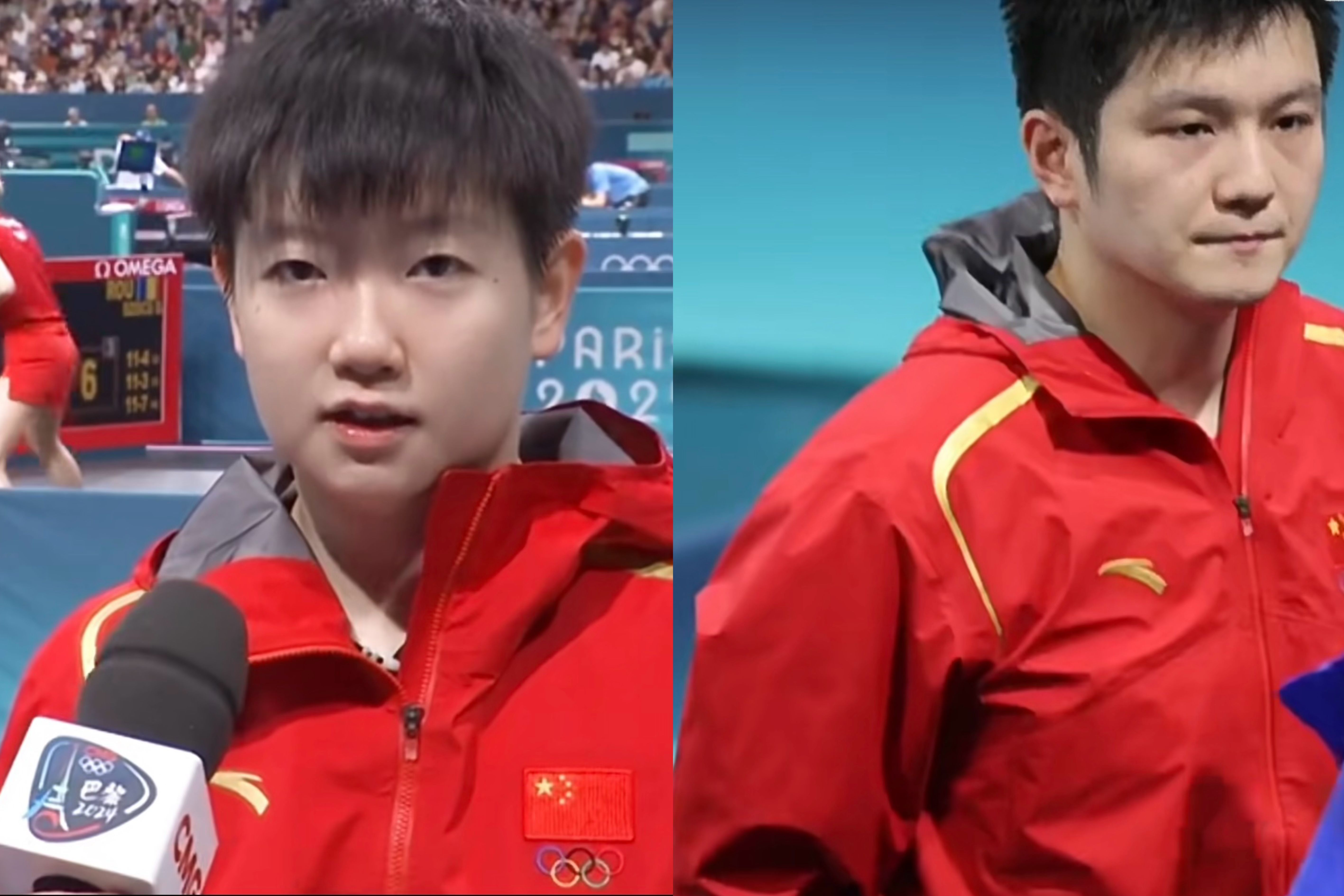 在采访中,孙颖莎、樊振东身穿安踏红色夹克。