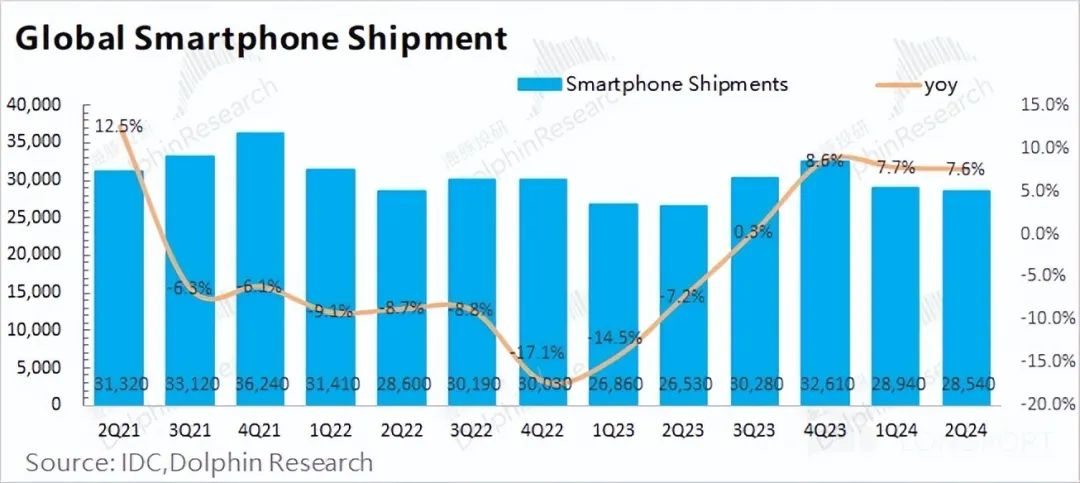 根据行业数据,2024 第二季度全球智能手机出货量为 2.85 亿台,同比增长 增长率相对稳定的7.6%。虽然移动电话的出货量从底部有所增加,但仍然相对较低, 3 亿台下面。这种情况主要是因为目前手机行业的整体需求仍然较弱。