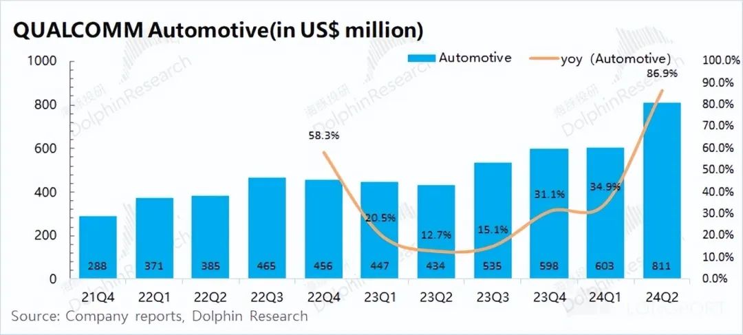 高通汽车业务在那里 2024 财年第三季度(即 实现收入的24Q2 8.11 亿美元,同比增长 86.9%。在公司主营业务中,汽车业务增长最快,增长主要来自于搭载我们骁龙数字驾驶舱商品的新车需求的增加。