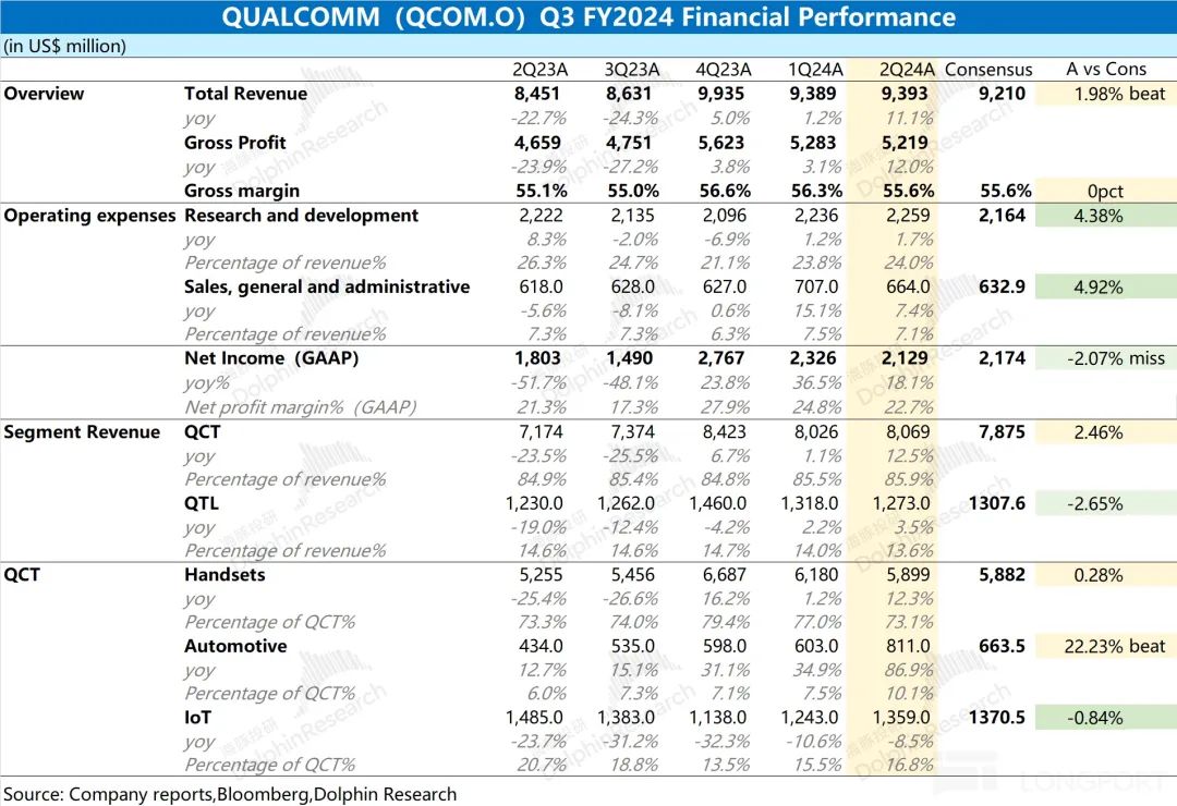 高通在 2024 财年第三季度(即 实现收入的24Q2 93.93 亿美元,同比增长 市场预测略优于11.1%(92.10 亿美金)。由于智能手机业务汽车业务的推动,本季公司收入增速加快。