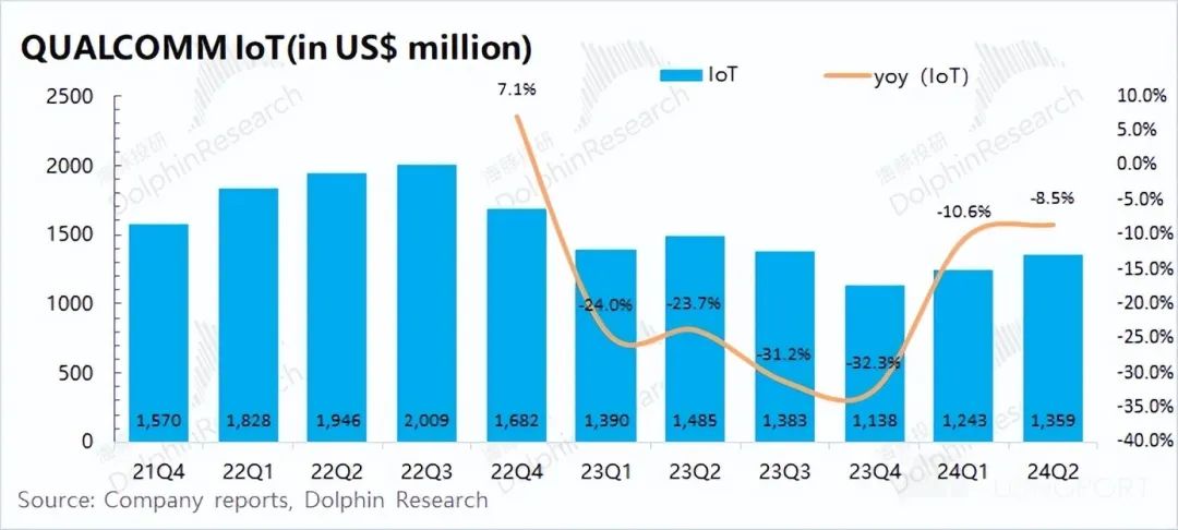 高通的 IoT 业务在 2024 财年第三季度(即 实现收入的24Q2 13.59 亿美元,同比下滑 8.5%。IoT 业务下滑有所收窄,但仍未扭转下滑局面。当前 XR 等待消费电子产品的需求低迷是 IoT 业务下滑的主要因素