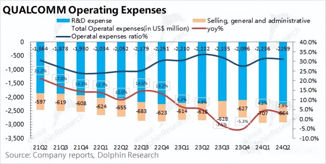 高通在 2024 财年第三季度(即 经营费用为24Q2) 29.23 亿美元,同比增长 2.9%的销售费用和R&D费用都有不同程度的增长。
