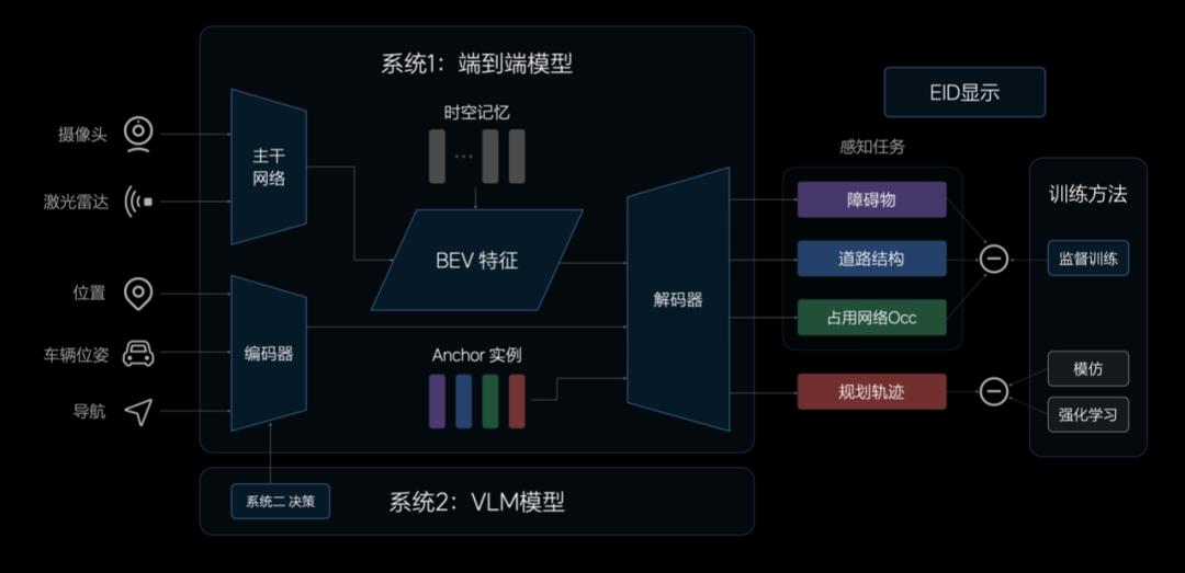 为使系统具有更好的性能,理想仍然在端到端模型之外,并联一个视觉语言模型(VLM)。前一种用于快速处理驾驶。 95% 常规问题;后者具有一定的逻辑推理能力,用于解决问题 5% 复杂的问题。理想地将其描述为-系统。 1 和系统 2。