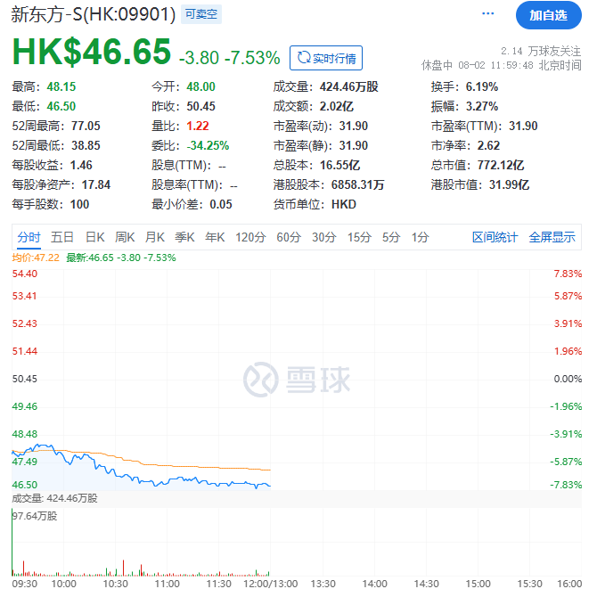 八月二日上午,新东方股价开盘后下跌。截至中午收盘,新东方股价下跌7.53%,报46.65元/港股。