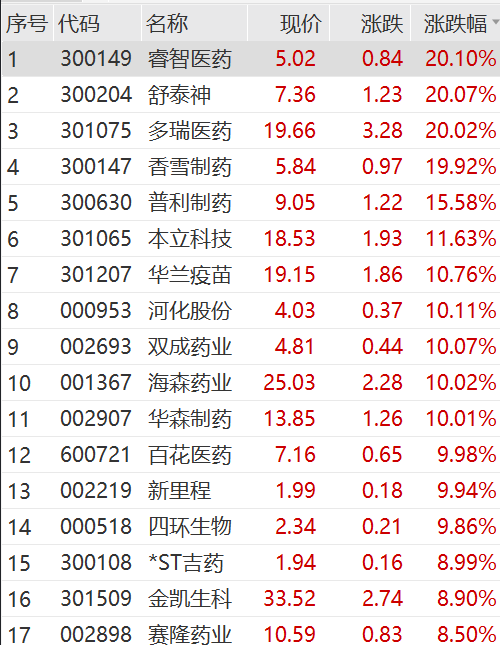 个股方面, 睿智医药、舒泰神、多瑞医药、香雪医药走出20CM涨停。,普利药业、本立科技、华兰疫苗上涨10%以上,河化股权、双成药业、海森药业、华森药业、百花医药等集体涨停。