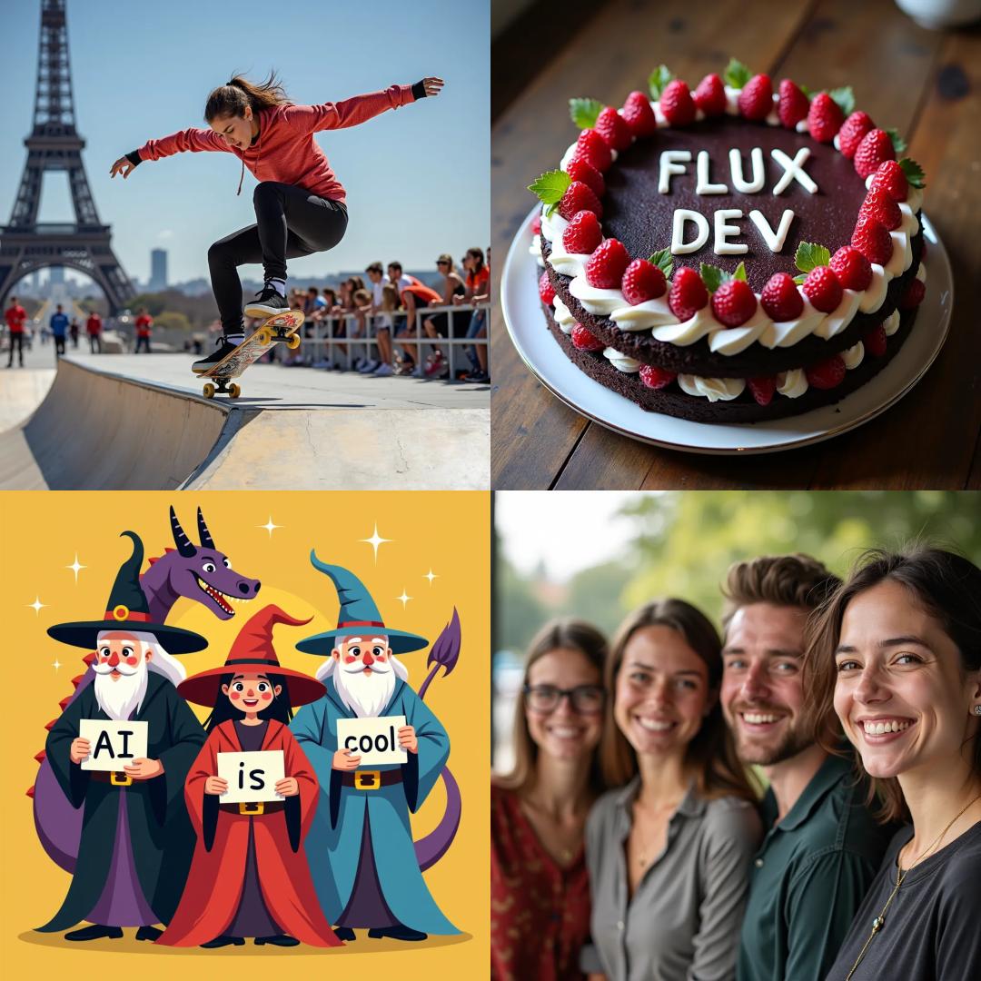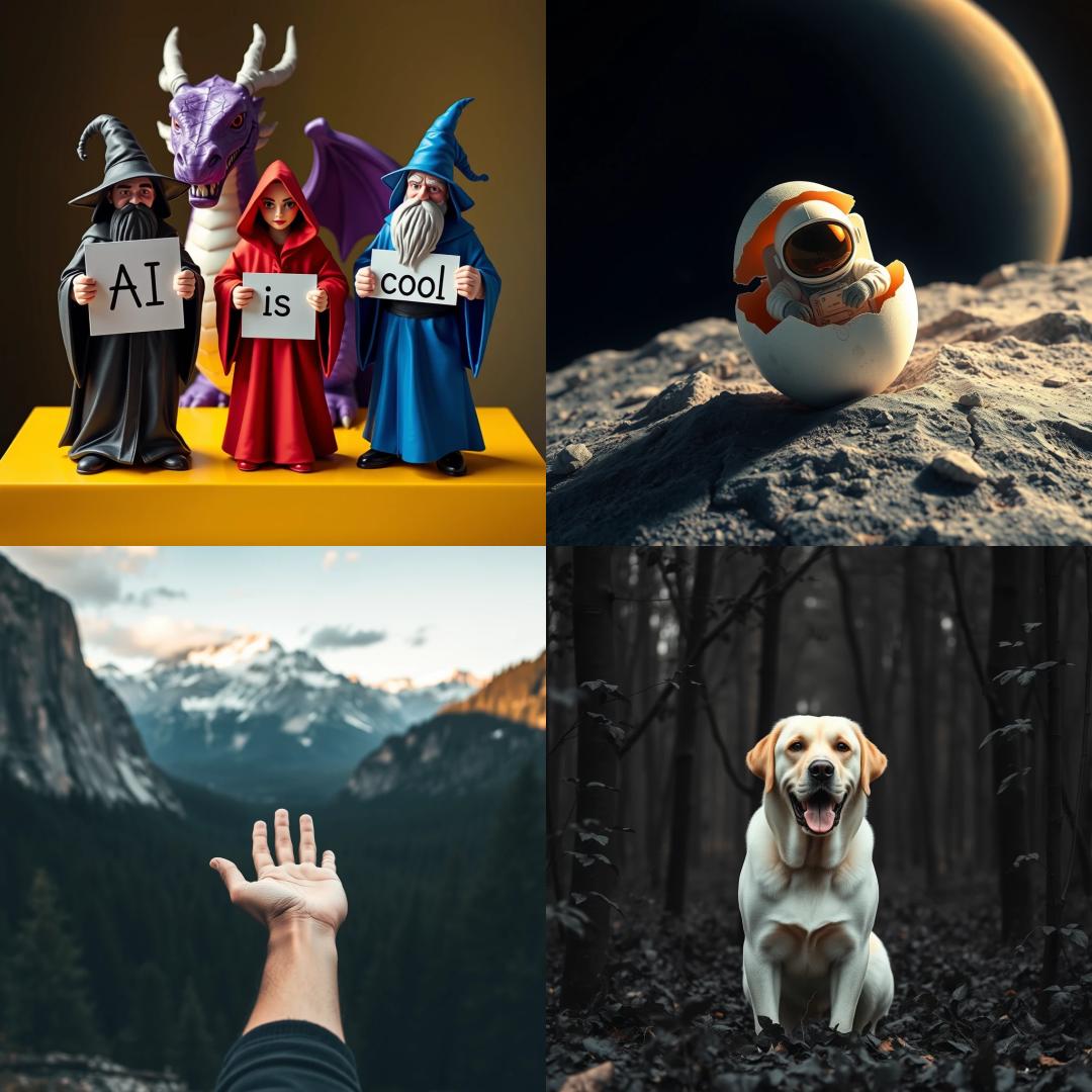 就构图而言,FLUX.1善于按照图像中的复杂指示操作事物应该位于哪里。例如,FLUX.1这个提示词的完美演绎:三位法术巫师站在一张黄色的桌子上,每位巫师都有一个标志。左边,一位身穿黑色长衫的巫师拿着一位写着“AI”中间,一位身穿红色长衫的女巫拿着一位写着“is”在右边,一位身穿蓝色长衫的巫师拿着一位写着“cool”的象征。