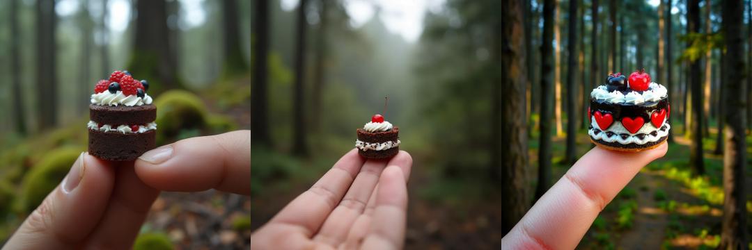 FLUX.1目前已经可以在Replicate开源平台上使用,下面是我用的提示词“世上最小的黑森林蛋糕,手指大小,被黑森林的树木包围着。",在三个模型上生成的图像,耗时分别是17.5s、12.2s、1.5s。