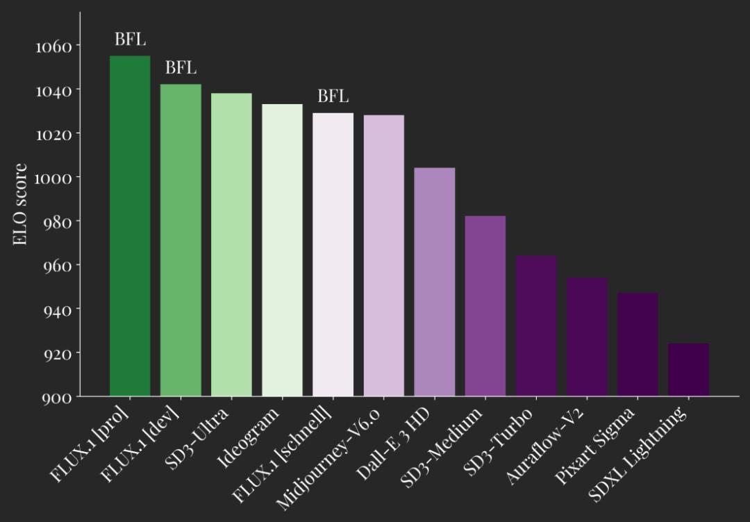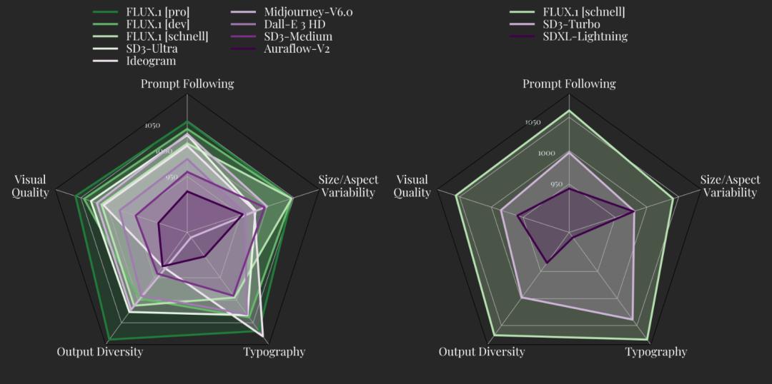 性能方面,FLUX.1经过特别微调,整个导出多样性在预训练中得到了保留,新的规范在指令遵循、视觉质量、尺寸/长宽变化等方面得到了建立。