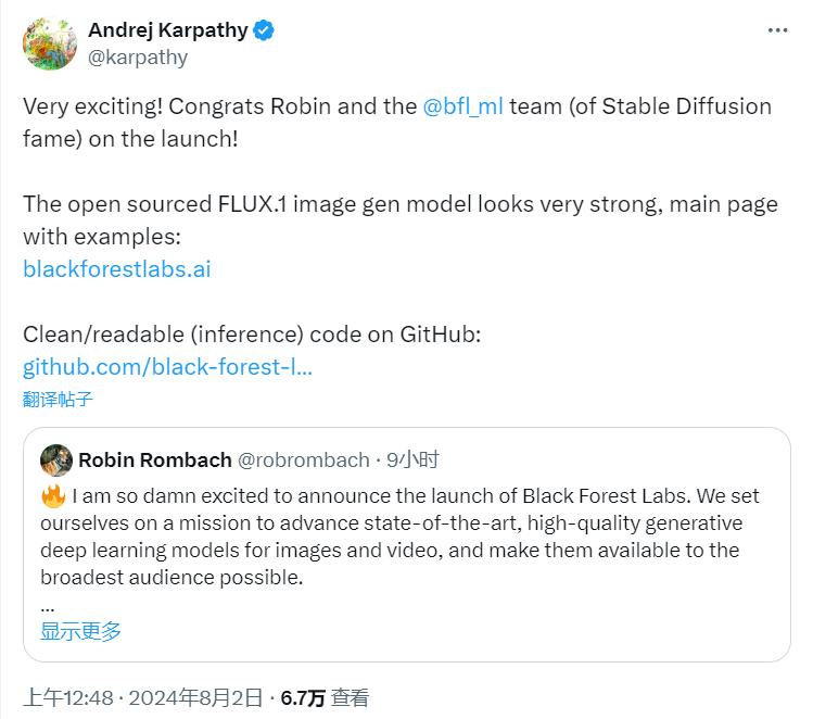 刚创业的AI大神安德烈·卡帕西(Andrej Karpathy)祝福黑森林队,并称“FLUX开源”.图像生成模型看起来很强大。
