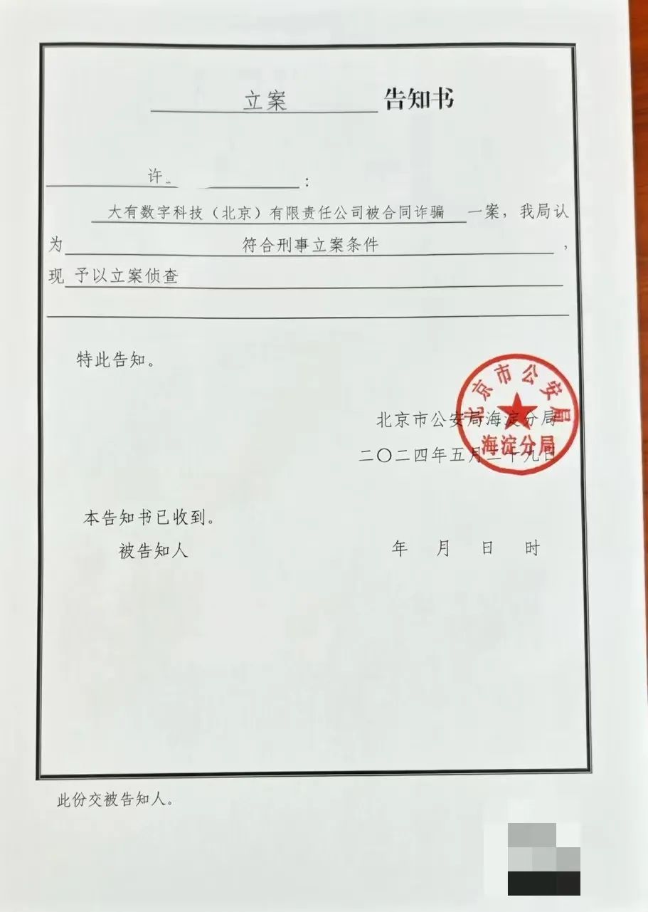 声明还提到,2024年2月,在了解到另一家上市公司创意信息发布的创意信息被四川综能合同诈骗立案公告后,大有科技在催款过程中发现四川综能涉嫌违法犯罪,并于2024年5月29日收到北京市海淀分局发来的《立案通知书》。