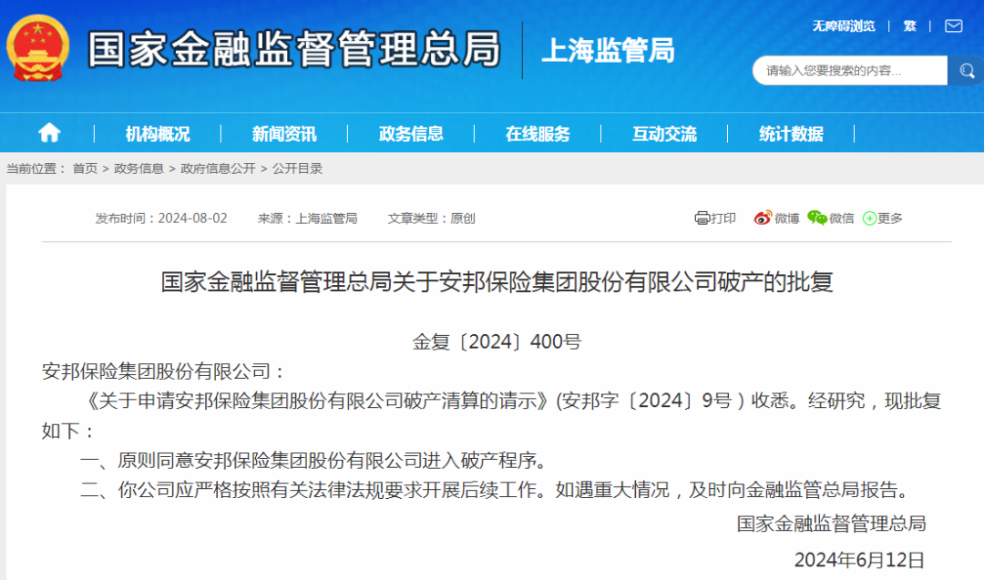 八月二日消息,国家金融监督管理总局近日发布批准,同意安邦保险集团有限公司和安邦财产保险有限公司进入破产程序。批准原文如下:
