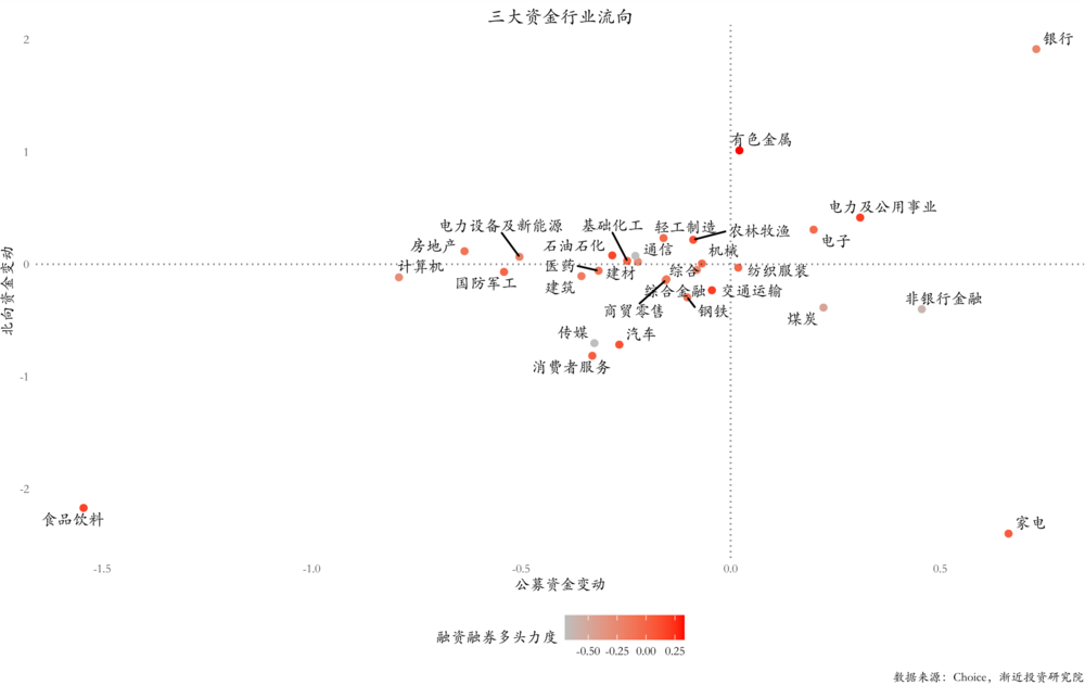 从行业维度来看,第二季度三大基金的共识是,在有色金属、电力、公共事业、媒体减持等领域,北向基金和公募基金也共同增加了银行和电子行业的仓位,共同减持了消费服务、汽车等领域,但融资融券与前两者矛盾较大。 在食品工业、消费者服务、汽车等领域选择加仓。公开发行增加了更多的仓位,但主要是煤炭和非银行金融向北减少;公开发行减持但北向资金增加的主要领域是农林牧渔、轻工制造等。