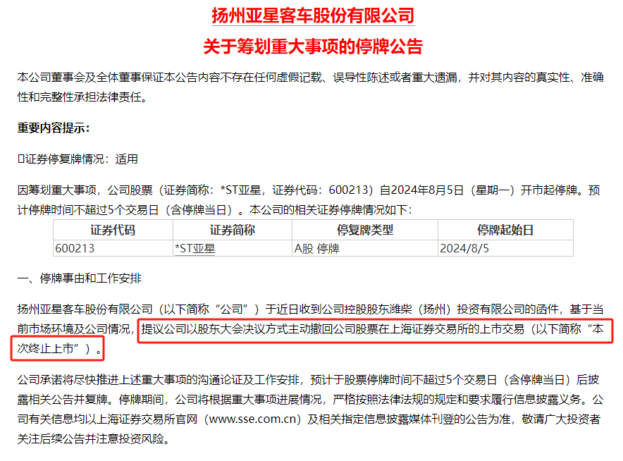八月二日晚上,*ST亚星宣布,近日收到公司控股股东 潍柴(扬州)投资有限公司根据当前的市场环境和公司情况,函件, 在上海证券交易所上市交易(即主动退市),建议公司以股东大会决议的形式主动撤销公司股票。。