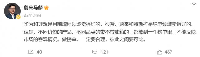 没过多久,蔚来的品牌和传播副总裁马麟发了一条微博,说发布周榜的动作是低质量的内卷,不是什么好事,而是直接给了李思。