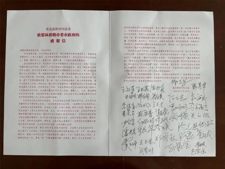 7月31日,市委宣传部收到了建矿初期企业家代表的感谢信。在信中,他们深情地回顾了在霍林河创业的艰辛历程,表达了对霍林郭勒现在事业和未来发展的无限憧憬。