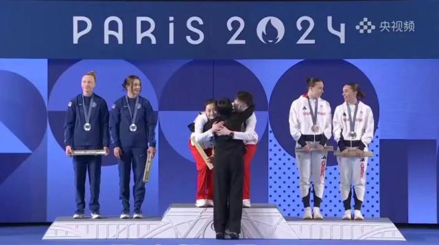 在中国夺金之后,陈若琳穿越人海,奔向郭晶晶。