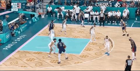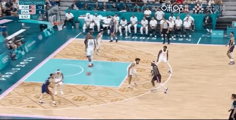 但是波多黎处处领先,美国队比较慢, 库里连得 5 分割后,对面暂停。